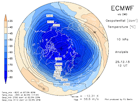 40-45 m/s by DAY 10. This shows that the PNJ ( Polar Net Jet ) is weakening with time as temperatures in the core of the vortex begin to warm ( decreasing the horizontal temperature gradient across the vortex which is being squeezed ). Climatology says this is a positive sign for winter fans in mid latitudes of the USA ( and later western Europe ) should it continue.